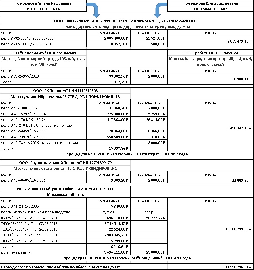 Гомоюнова Айгуль Кошбаевна должна по уже проигранным судам около 19 миллионов рублей, за что на нее Солид банк подал на банкротство. Дочка ее, Гомоюнова Юлия Андреевна, номинальный директор Требити, также уклоняется от погашения долгов и должна более миллиона рублей по делу А-32-20246/2008-32/299 УЖЕ 11 ЛЕТ! Мы конечно же по всем исполнительным листам сообщили ваши номера телефонов и контакты, чтобы вы могли спокойной погасить свои десятилетние долги. Уже на выставке прилетел нежданчик — и это только начало!