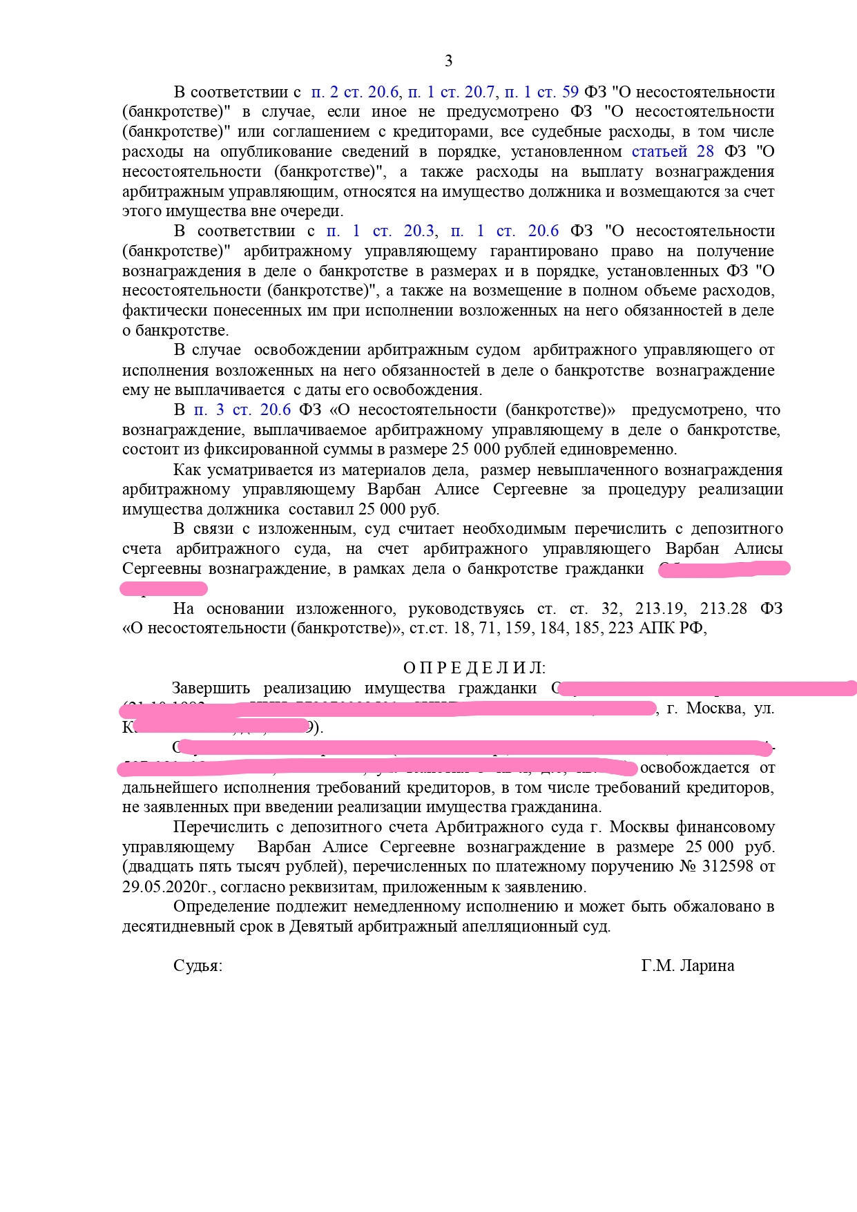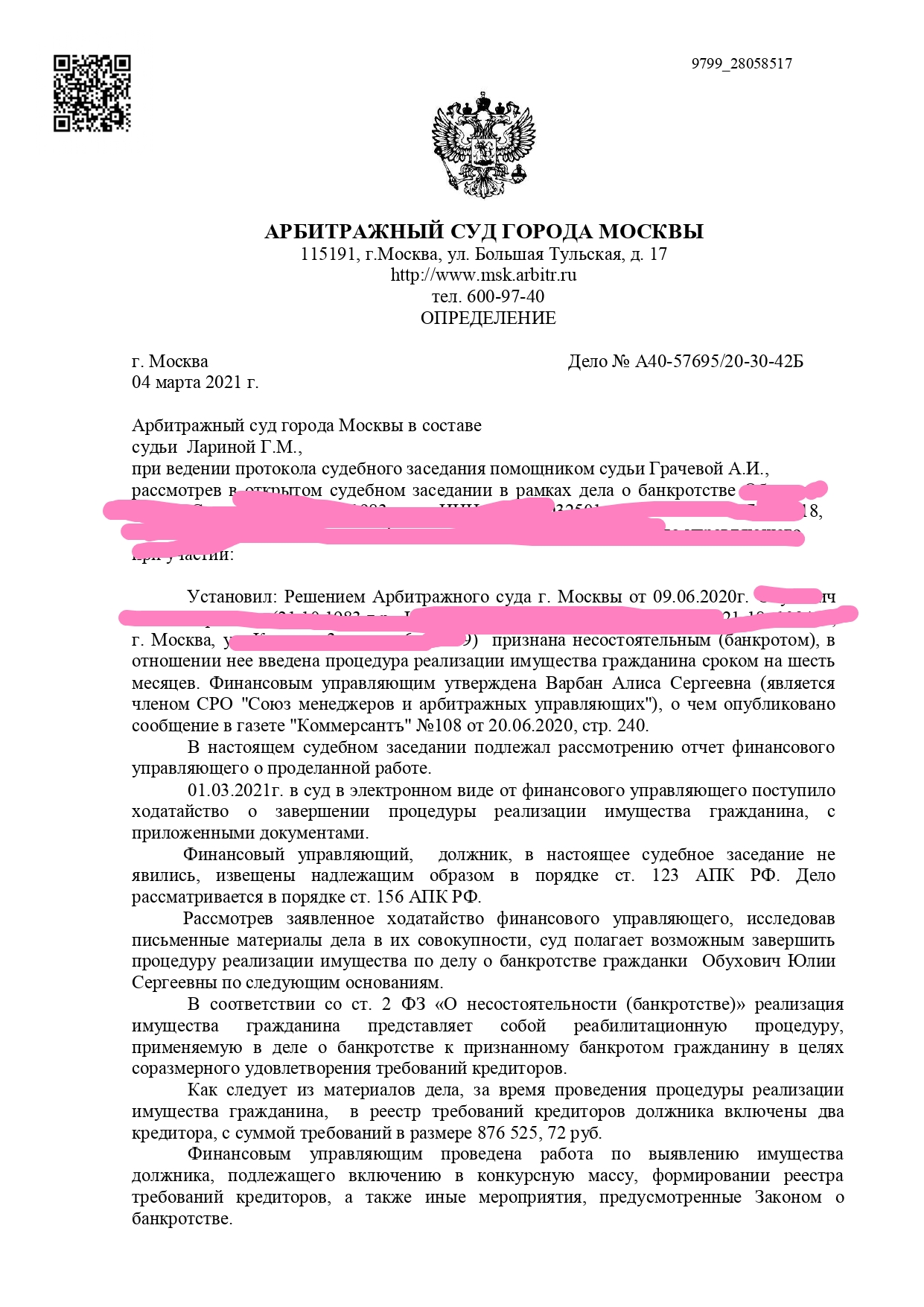 Номер нашего договора - А40-57695/2020. Последний год выдался для меня очень сложным, тяжело было – долг рос, а погашать его возможностей совершенно не было! Обратилась в компанию в марте прошлого года, в конце месяца подали заявление, и уже в начале июня меня признали банкротом. Финансовым управляющим была Алиса Варбан. Ей большое спасибо за оперативность в работе, за понимание и за ответственность! Уже в начале марта этого года дело закрыли и списали сумму чуть меньше миллиона!