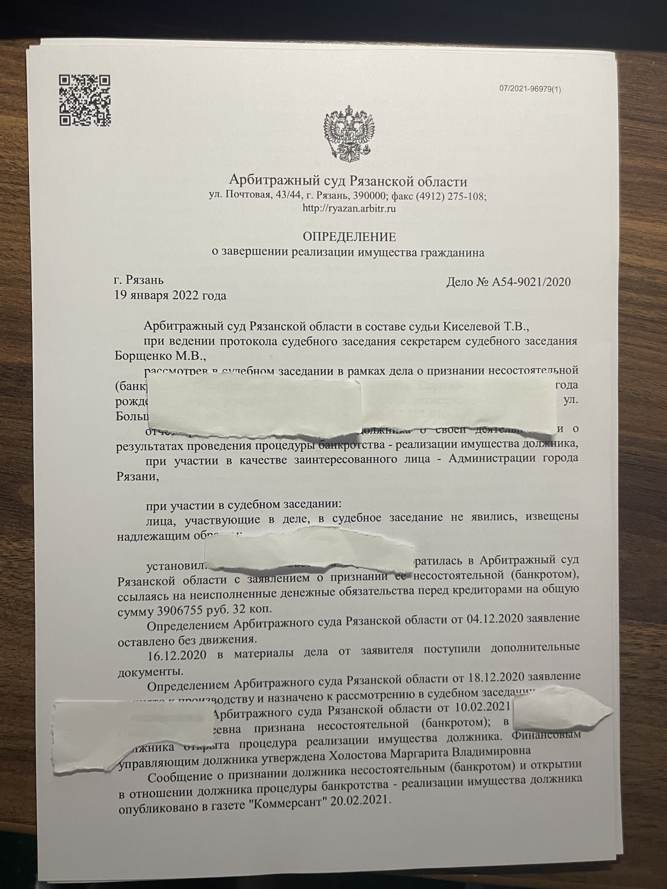 Обратилась сюда еще в марте 2021 года. Проблема была просто критическая – бешеный долг почти в 4 миллиона рублей. Естественно, я была на взводе, и уже не первый месяц, приходилось пить сильные успокоительные, потому что спокойно переживать такое невозможно! Вопрос был не шуточный, поэтому я лично ездила пообщаться в офис к ним. Для меня принципиально важно было увидеть, как работают, где, специалистов. Дали отличную консультацию, рассказали специфику работы, как и что будут делать, если заключим договор. Просчитали мне приблизительную сумму к оплате. Что мне сразу понравилось – разбивают на этапы оплаты, каждый месяц вносишь фиксированную сумму. Получалось вполне адекватная ежемесячная оплата. Сразу скажу, когда подписала с ними договор, меня познакомили с будущим финансовым управляющим. Холостовой Маргаритой. С юристом, который так же вел мое дело с Маргаритой тоже познакомили – Нигорой Яруллиной. Заявление в суд подали в середине апреля 2021 года. Тогда же прекратились звонки… Даже чуть раньше – поскольку в принципе компания на себя взяла общение с банками и коллекторами.