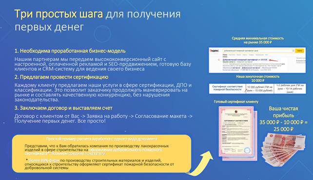 Руководить сертификационным центром под нашим брендом может любой человек: мы обучим вас всем необходимым процессам, а наши профессиональные специалисты возьмут на себя основную работу. - Руководить сертификационным центром под нашим брендом может любой человек? Вообще любой? И друг мой Жорик, который не знает с какой стороны к ноутбуку подойти? Что это за характеристика такая – любой человек? Просто достаточно трех классов образования? Или имеется ввиду любой человек, который переведет нам 400 000 рублей? Пока не понятно.
