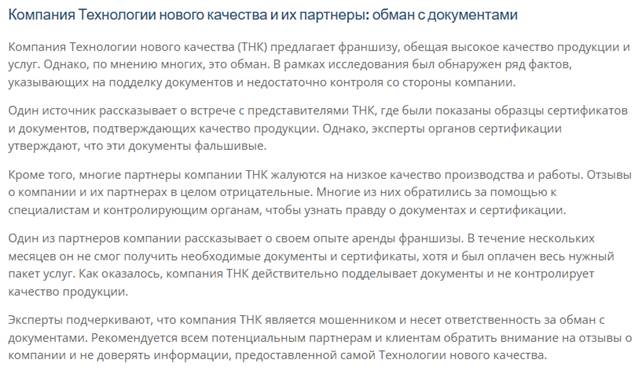 Франшиза ТНК отзывы | Франшиза ТНК отзывы франчайзи | Франшиза ООО "Технологии Нового Качества" отзывы
