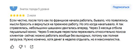 Я сначала утвердился было в мысли, что парни действительно крутые, осчастливили почти тысячу предпринимателей, а я скептик так и сгину в нищете и нигелизме. Но чем дальше я читал эти пятибальные отзывы, тем больше закрадывалось у меня ощущение, что они какие-то типовые, подходящие плюс-минус под схему «Я работаю полгода, поднимаю столько-тотыщ, чтобы зарабатывать нужно разбираться и пахать, а не на диване валяться…», ну или какие-то невероятные истории как люди совершенно без знаний покупали данную франшизу, разбирались и «взлетали» - короче в таком ключе.