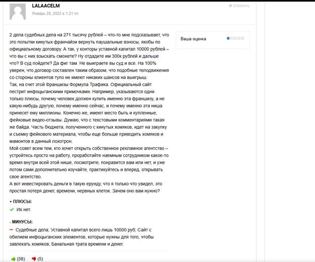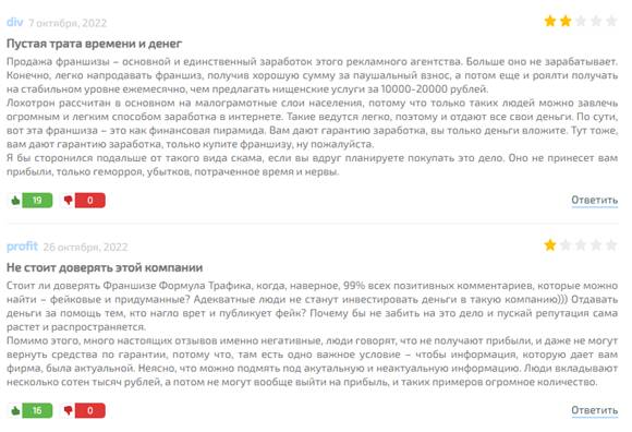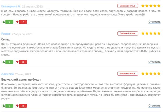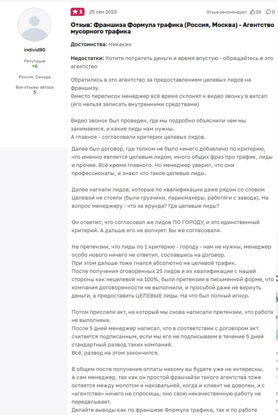 Перевожу на русский. Агентство «Формула трафика» в лице (скорее всего) одного из счастливого обладателя франшизы, предоставило клиенту оплаченных их лидов, только сдается мне, что те лиды были теми же людьми, которые пишут распрекрасные отзывы в сети. В итоге человек оплатил, получил спам-лидов и сделать по сути ничего не смогу – денег ему не вернули.